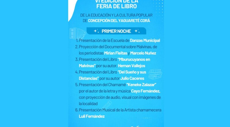 Los días 24, 25 y 26 de abril se llevará adelante en Concepción del Yaguareté Corá. La 6ta Feria del Libro de la Educación y la Cultura Popular, la misma es organizada por la Dirección de Cultura del Municipio de Concepción del Yaguareté Corá.