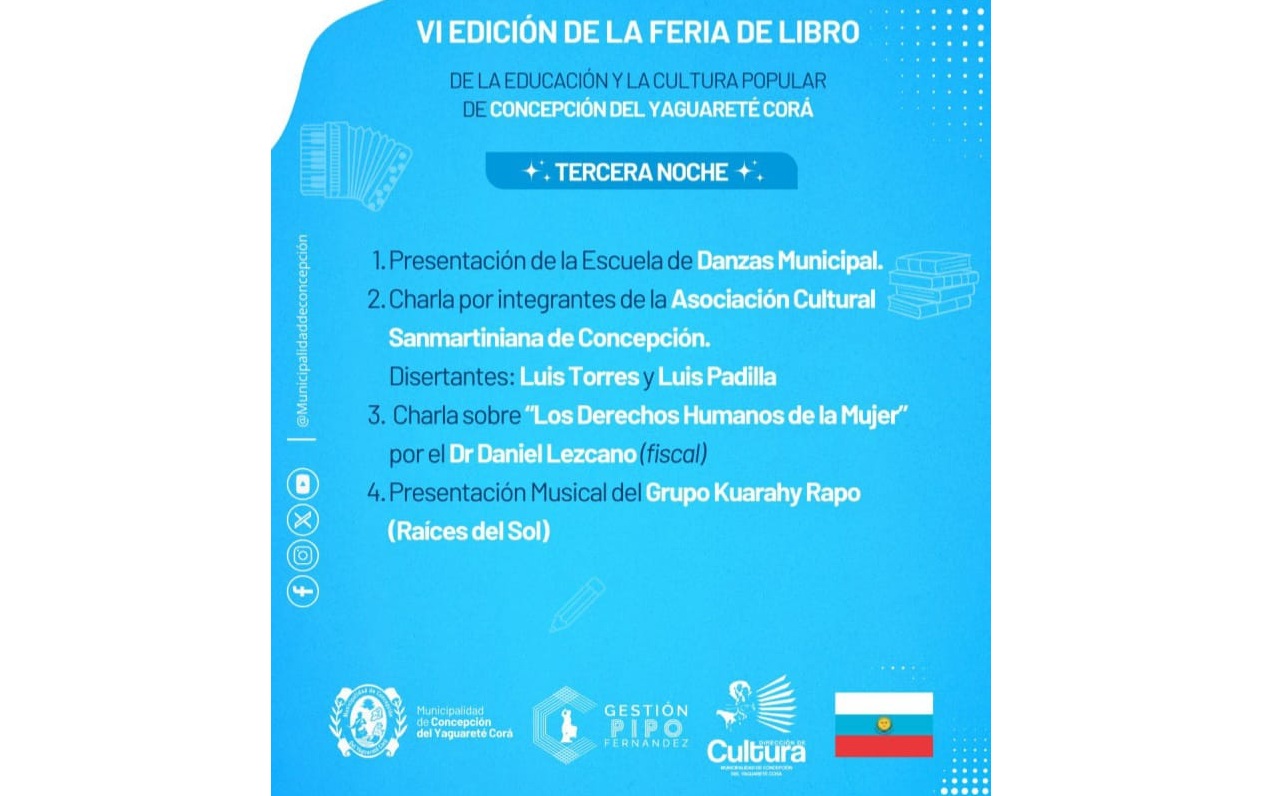 Los días 24, 25 y 26 de abril se lleva adelante en Concepción del Yaguareté Corá. La 6ta Feria del Libro de la Educación y la Cultura Popular, la misma es organizada por la Dirección de Cultura del Municipio de Concepción del Yaguareté Corá.